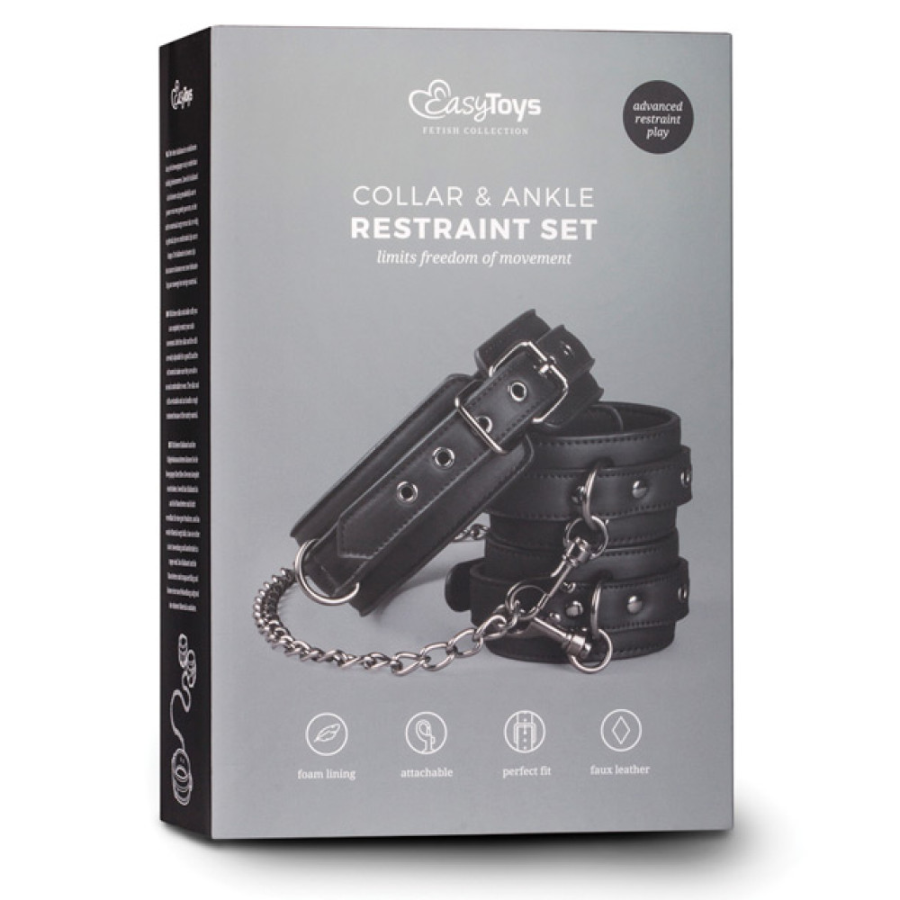 Bind your partner's ankles and neck together with this beautiful collar with ankle cuffs and enjoy the feeling of control! They are made of faux leather, which gives them a luxurious look. Both the collar and cuffs are adjustable, so they will surely fit. With this collar you will definitely experience exciting and sexy SM play.