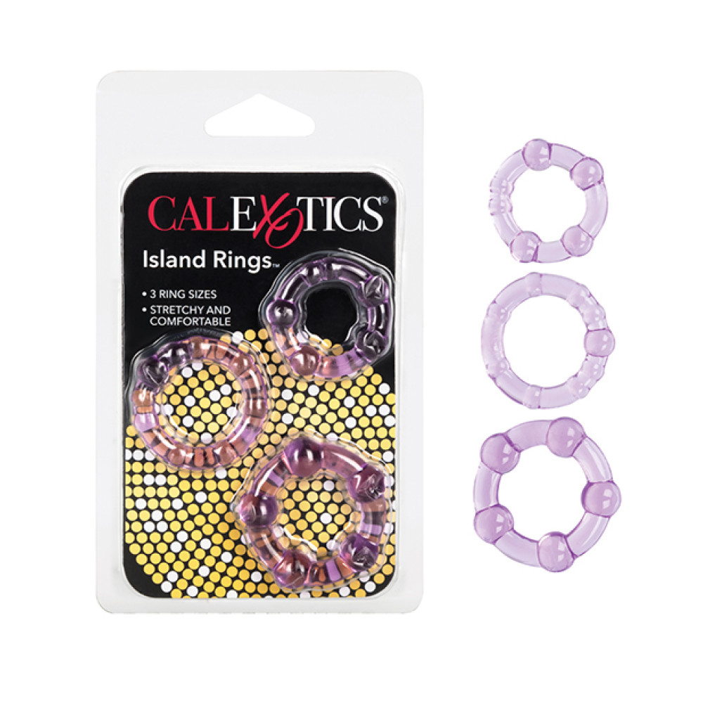Ring the changes with the exotic Island Rings. The trio of stretchy erection enhancers put you in full control of your stamina maintenance and stimulation pleasure. The small, medium and large size all purpose cock rings are designed for extended intimate play and spontaneous satisfaction. Select your preferred enhancer, and enjoy tantalizing tingles of ecstasy and non-stop action.The rings are made from soft, smooth and flexible, transparent TPR and are adorned with sensuous pleasure beads and stimulation nodules, for e