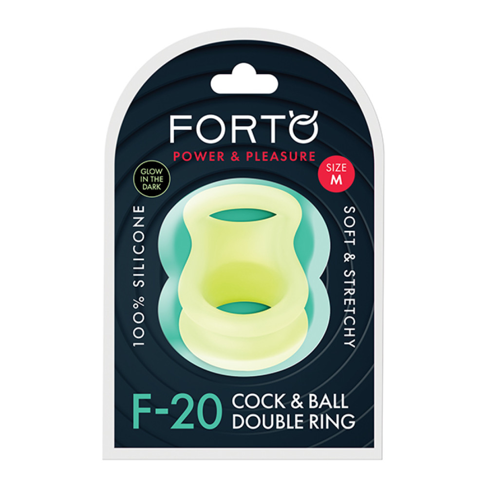 Forto Power & Pleasure. Explore New Thrills. F-20 Glow in the Dark 100% Liquid Silicone Cock and Ball Double Ring. Soft and Stretchy. Stretches up to 2x its size.