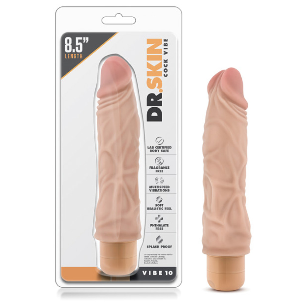The doctor is in! Dr. Skin Cock Vibe 10 is a realistic vibrating dong with a veiny, textured shaft that erotically massages as you thrust. The powerful, throbbing vibrations are controlled by a convenient, high-to-low twist-dial base. It's waterproof for shower and bath time. Vibe 10 is made of non-porous and body safe PVC that contains no phthalates, latex, paraffins, or chemical fragrances. To clean, use soap and water or a toy cleaner, then let air-dry.