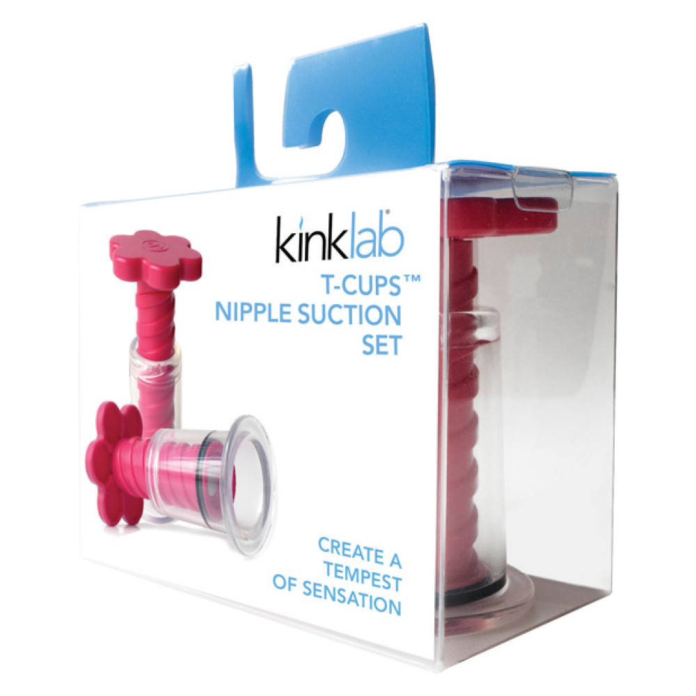 The Kinklab T-Cups Nipple Suction Set. Simple and easy to use on virtually any sensitive spot on the body, but perfect for teasing and pleasing nipples! Cylinder Diameter: 1.75in. Full Length: 5.5in. Made of ABS plastic, rubber, and steel. Comes in a set of 2.