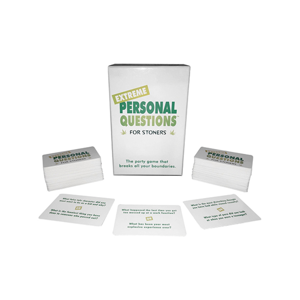 Extreme Personal Questions for Stoners. The popular party game now with pothead humor. What you learn about your friends might scare you, with this very personal game of questions. Players take turns asking the group questions and the first two volunteers share their answers. The group votes for their favorite answer; and that player wins the card as a point. The first player to collect five cards wins. Brace yourself, the questions get hugely personal. Includes 200 game cards and easy-to-follow rules.
