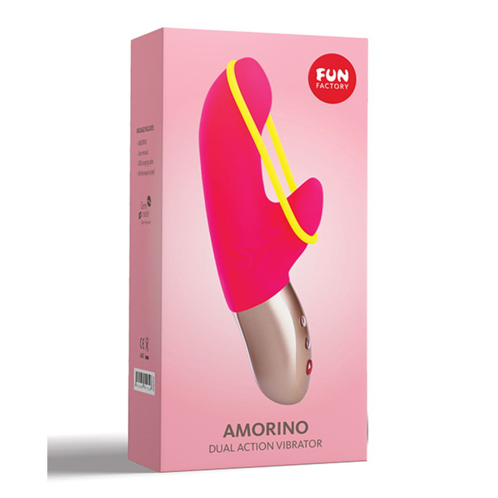 Let us break it down for you: the AMORINO is a dual action vibrator, shaped so that you can set the shorter extension against your clit and rock the curved shaft against your G-spot. As if