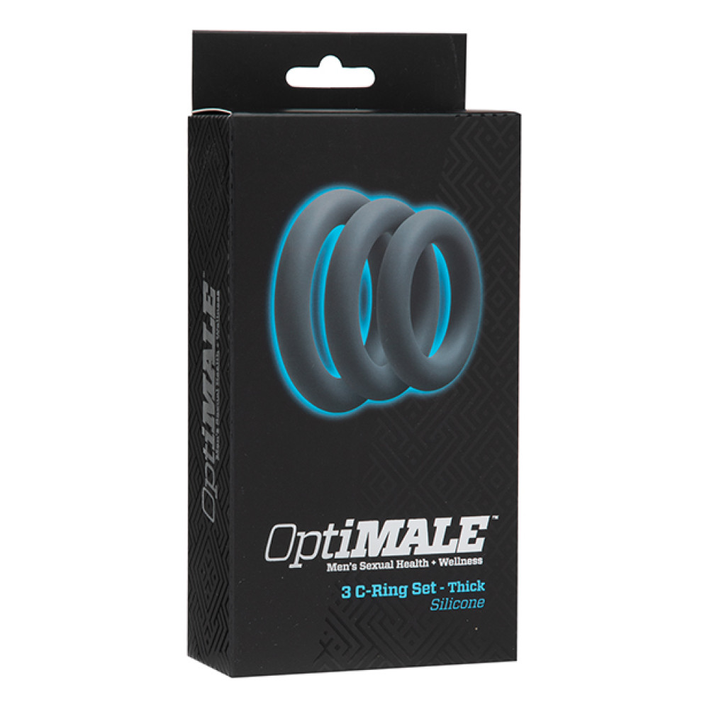 Optimize your experience with these silicone cock rings! The OptiMALE Thick C-Ring Set offers enhanced size and girth with three rings in 32mm, 37mm, and 42mm diameters. These rings are ultra-stretchable for easy use around the shaft or testicles, maintaining those long-lasting erections you've always dreamed of, and prolonging your ejaculation. Available in Black and Slate; phthalate-free silicone.