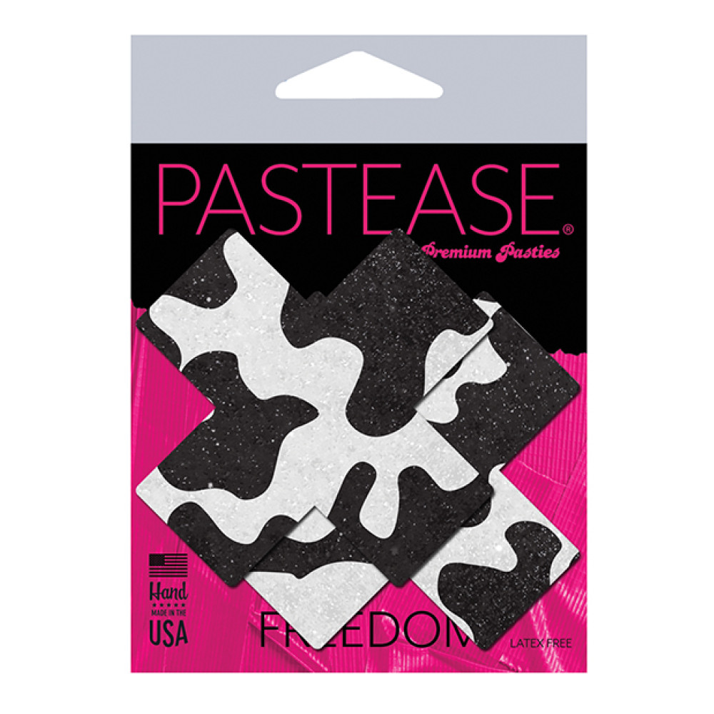 Plus X: Black & White Cow Print Cross Pasties by Pastease® are hand-made in the USA of soft form-fitting material that forms seamlessly to curves and resists wrinkling over hardening nipples.