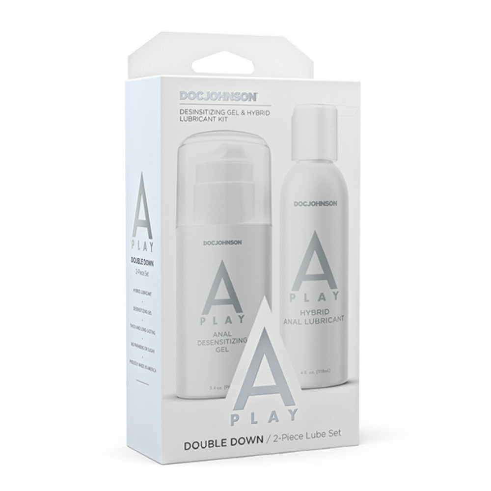 Make anal play easy with this A-Play 2-piece set! It includes two types of lube: Hybrid, which is a combination silicone and water-based lube, and Desensitizing, which relaxes your muscles for easier anal play.