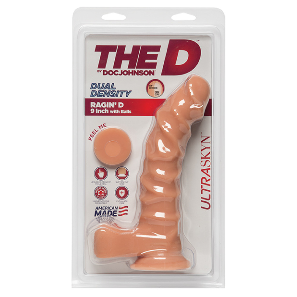 Everybody wants it! The Ragin' D is Nine full inches of lifelike dual density ULTRASKYN(TM) handcrafted to satisfy with a soft, pliable exterior and firm inner core. The realistic contoured head, heavily textured veins, and prominent curve look as good as they feel hitting all your hot spots, while a sturdy suction cup base holds it steady for your roughest rides. Made in the USA.